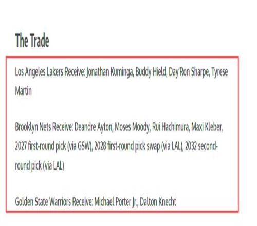 具体交易方案明细已基本敲定。洛杉矶湖人将送出八村塁、克莱伯、艾顿,得到库明加、希尔德、戴伦·夏普、马丁四位即战力球员;布鲁克林篮网将送出迈克尔·波特二世、道尔顿·克内希特,收获艾顿、穆迪、八村塁、克莱伯,以及2027年勇士首轮选秀权、2028年湖人首轮选秀权交换权和2032年湖人次轮选秀权;金州勇士则送出库明加、希尔德、穆迪,得到梦寐以求的迈克尔·波特二世和克内希特。