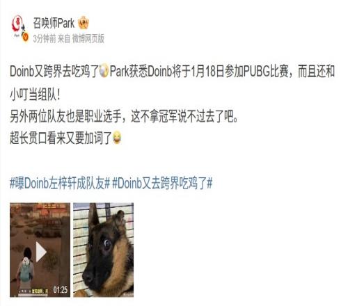 oinb又跨界去吃鸡了Park获悉Doinb将于1月18日参加PUBG比赛,而且还和小叮当组队!
