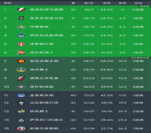 卫冕冠军雷霆打了42场比赛,以35胜7负稳居第一,胜率高达83.3%,领先了身后的马刺和掘金6.5个胜场。马刺和掘金都是打了41场比赛,取得了28胜13负,胜率是68.3%。森林狼今天对阵火箭队,在缺少了爱德华兹的情况下105-110憾负,两连胜被终结,以27胜15负暂列第4名,只领先火箭和湖人0.5个胜场,而且他们比火箭和湖人多打了3场比赛,未来排名有可能继续下滑。