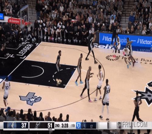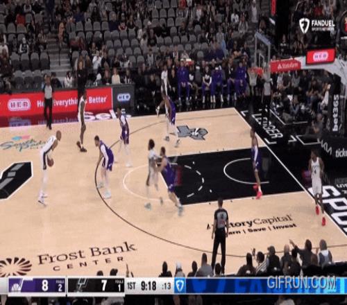 还是马刺最快的福克斯来跟华兹,被华兹迎面强投:干扰不到。