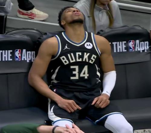 保护了自己全场,结果最后时候受伤,字母哥非常沮丧,默默就走回了更衣室。结果往更衣室走的时候,突然听到场上在欢呼,他又走回替补席坐在板凳席上看球。但是可以看到字母哥非常难受,捂着自己的脸很痛苦。