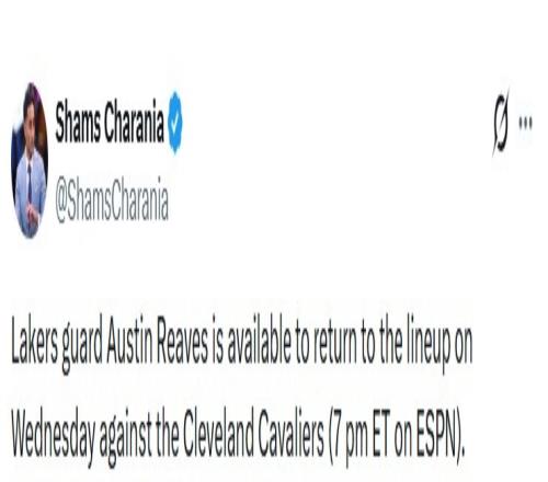 不过湖人随即更新了伤病报告,里夫斯不会在明天复出,Shams目前已经删除推特。