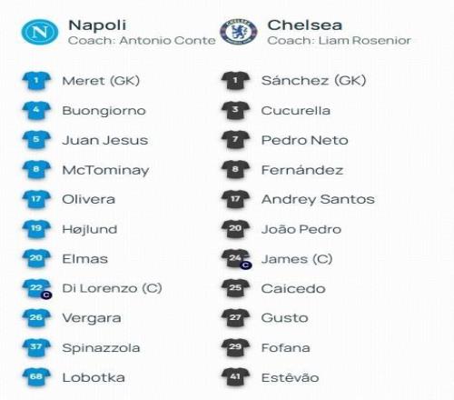 北京时间1月29日04:00,欧冠联赛阶段的一场对决。那不勒斯坐镇主场,迎战切尔西。赛前,双方的阵容公布如下: