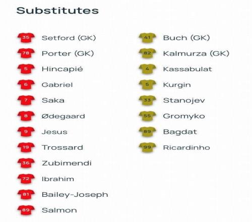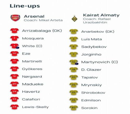 北京时间1月29日04:00,欧冠联赛阶段的一场对决。阿森纳坐镇主场,迎战阿拉木图凯拉特。赛前,双方的阵容公布如下: