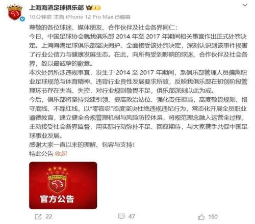 随后,上港也在俱乐部官方社交账号上发文,称俱乐部坚决拥护、全面接受足协的处罚决定。强调所涉违规事宜发生于2014年至2017年期间,是俱乐部管理人员偏离职业足球规范与体育精神、违背行业良性发展要求所致。上港表示,将以“零容忍”的态度坚决杜绝违规违纪行为,常态化开展全员职业道德教育,用实际行动弥补不足,回应期待。